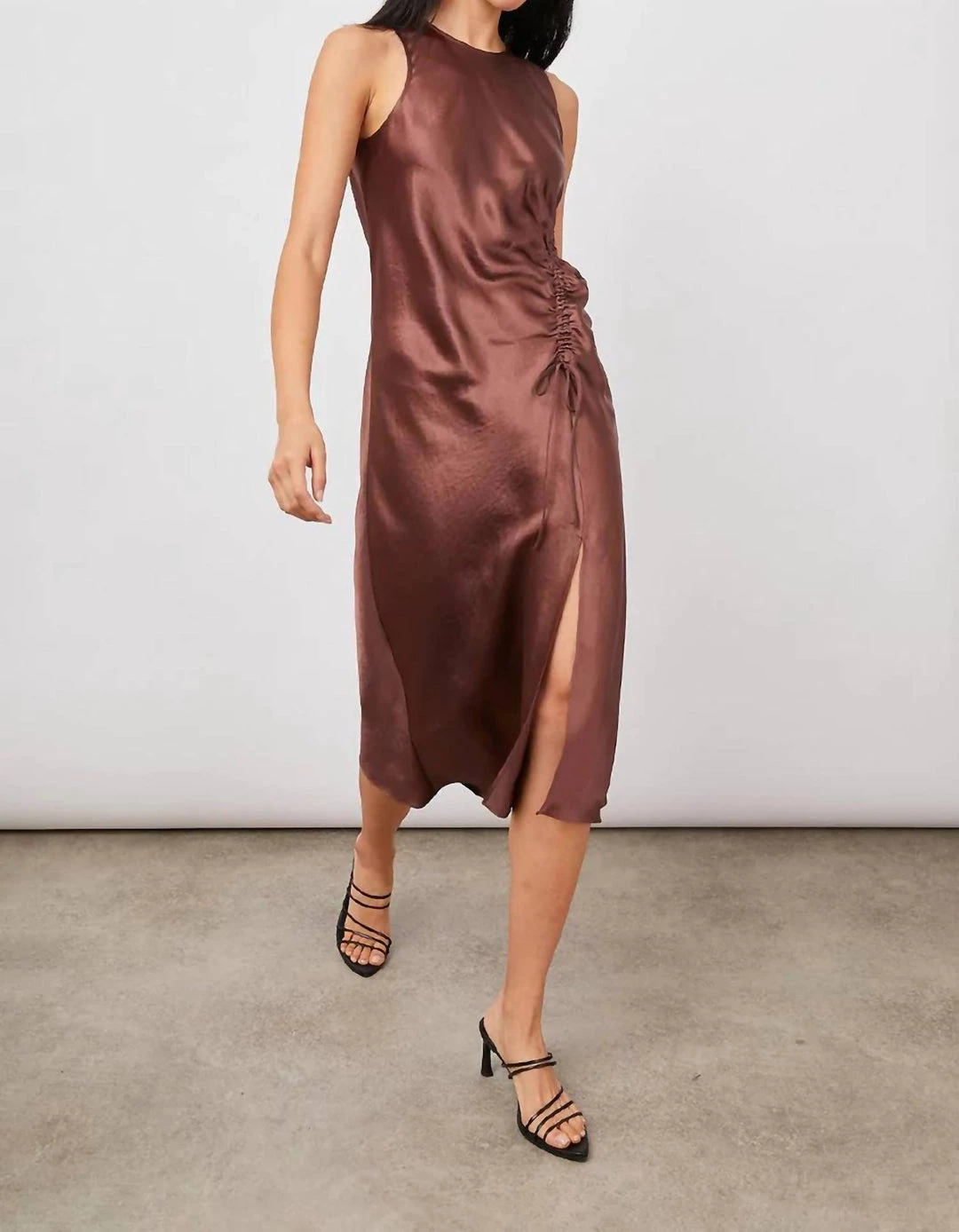 Make a statement with this flattering side slit midi dress. Made from lightweight textured crinkle satin, this dress features a unique ruched drawstring at the side body and a keyhole closure at back.100% Acetate.Imported.