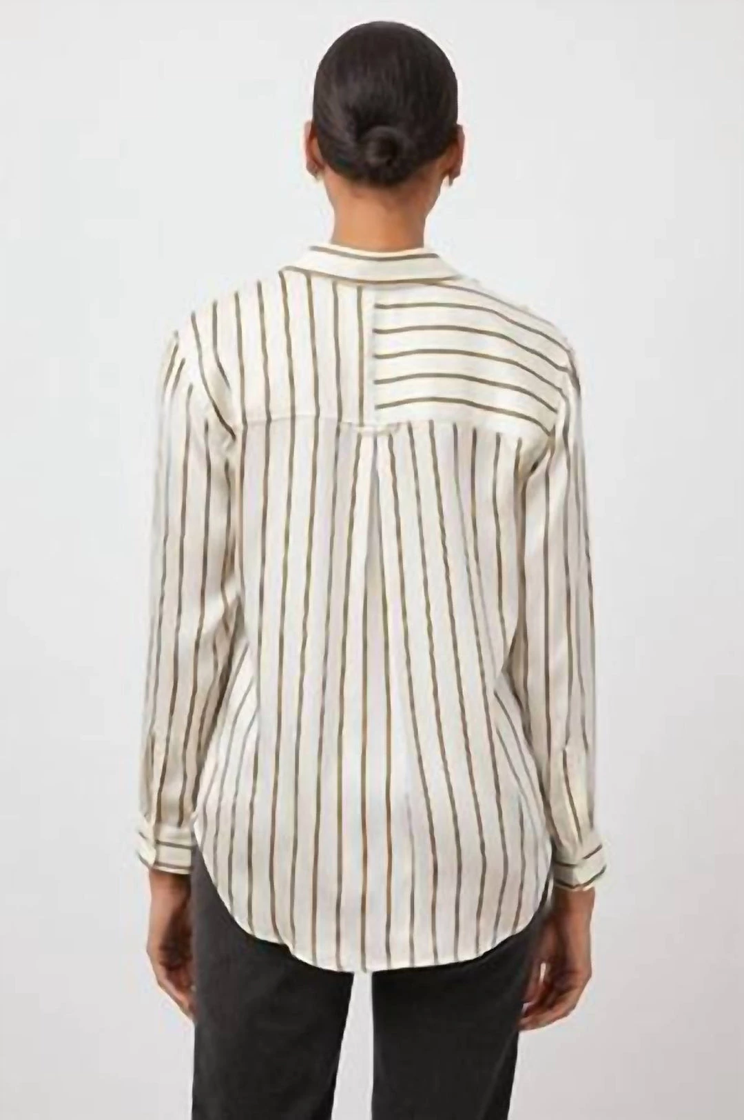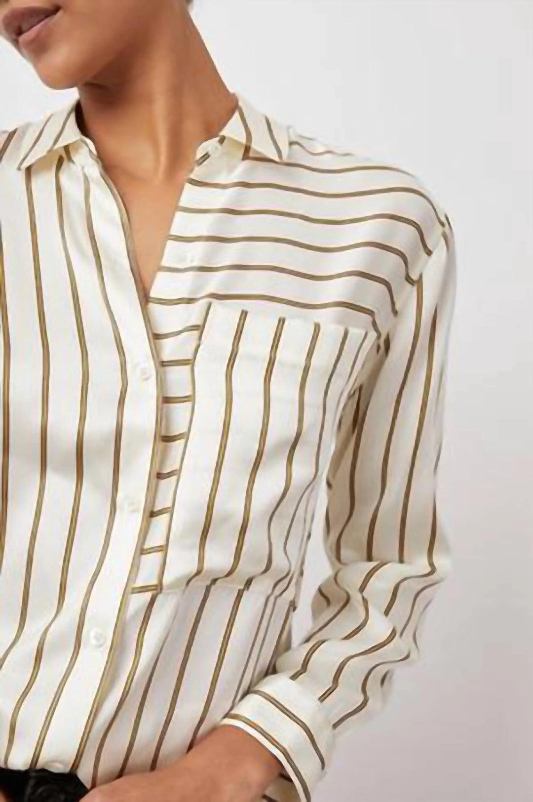 Super smooth, silk charmeuse, long sleeve, warm ivory collared buttondown shirt featuring mustard yellow and black mixed horizontal and vertical stripes, relaxed fit, oversized patch pocket at chest, and longer length. Look effortlessly refined and stylish in this unique buttondown shirt featuring luxe fabric for a polished finish.100% Silk.Imported.CARE |Dry Clean Only.FIT |Recommend ordering true to size.Front Body Length – 27 1/4″ (Measured from Small)Model is wearing size S.ModelΓ’β¬β’s Measurements – Height 5Γ’β¬β’10Γ’β¬Ε, Bust 34″, Waist 25″, Hips 35 1/2″